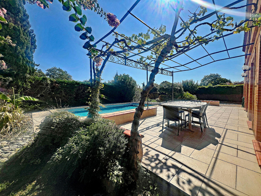 A l'extérieur : grande terrasse carrelée avec pergola donnant sur la piscine sans vis-à-vis, divers emplacements de stationnement en béton désactivé pour véhicules dont 2 couverts, grand abri à bois.